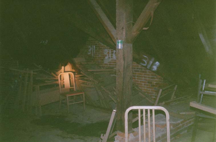 Climbing the rickety staircase, we entered the attic of the House of Nightmares. Up here were the last remnants of the building's original purpose: the metal cots and chairs from the old poorhouse dormitories.